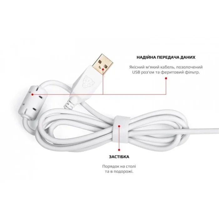 Високоякісний м’який кабель та позолочений USB роз’єм забезпечують якість контакту та безперебійність передачі даних, а застібка допоможе організувати кабелі на робочому столі та у подорожі.