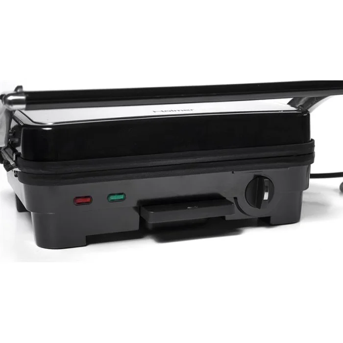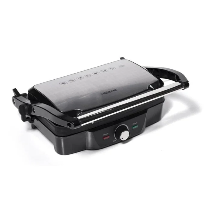 Ідеальне прожарювання. З контактним грилем Holmer HCG-160 не складно готувати різноманітні м’ясні, овочеві та рибні страви, а також розігрівати пироги, піцу або сендвічі. При використанні контактного гриля продукти готуються швидко, оскільки вони контактують з плитами одночасно з двох сторін, зберігаючи корисні властивості продуктів. Просто підберіть оптимальну температуру для ідеального прожарювання і виберіть одне з двох робочих положень гриля (кут відкриття конструкції – 105°/180°).
