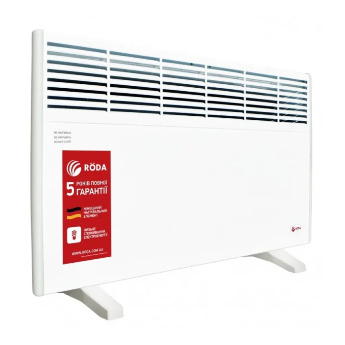 Електроконвектори Roda забезпечують швидкий і безшумний обігрів, а також види палива та наднадійними пристроями для основного та додаткового опалення приміщень будь-якого класу: заміських будинків, квартир, об'єктів соціальної сфери та комерційної нерухомості. Конвектори можуть бути змонтовані на стіну за допомогою кронштейнів або встановлені на підлогу з використанням пасивних опор (поставляється в комплекті). Електроконвектор RODA Standard + RSP працює за принципом природної конвекції повітря: холодне повітря, проходячи через конструкцію пристрою, нагрівається і виходить через ґрати. Завдяки спеціальній формі корпусу прискорюється циркуляція повітря із забезпеченням швидкого обігріву приміщення по всьому об'єму. Висока надійність конструкції, якість комплектуючих, 100% тестування в процесі виробництва дозволяє підтримувати термін гарантійного обслуговування протягом 5 років, а термін експлуатації не менше 10 років. Принциповою відмінністю нагрівального елементу в електроконвекторах RODA Standard + RSP є застосування в якості резистивного елемента тонкої стрічки прямокутного перетину.