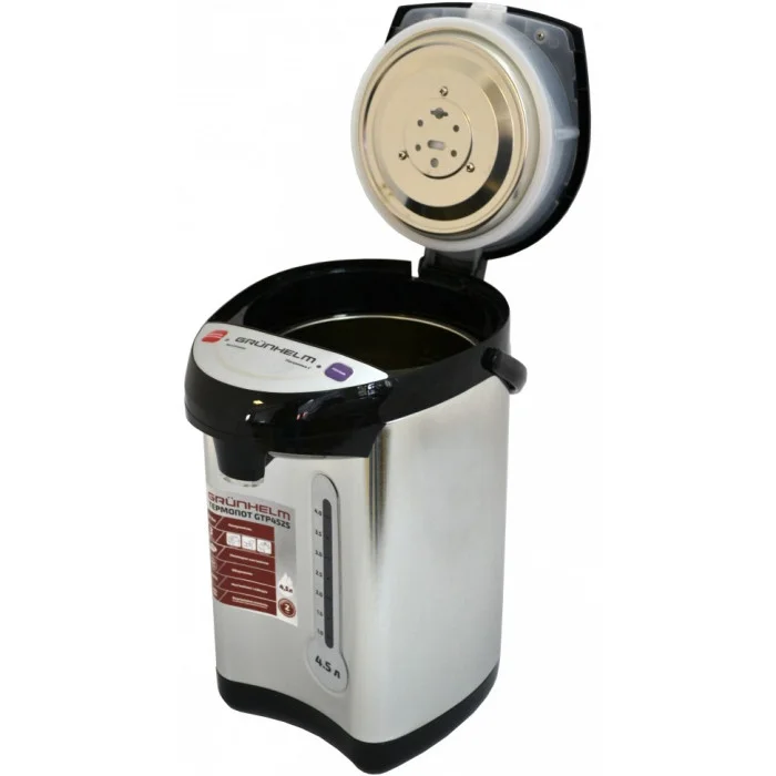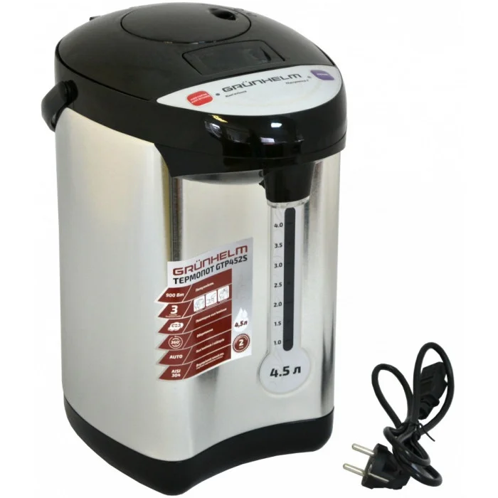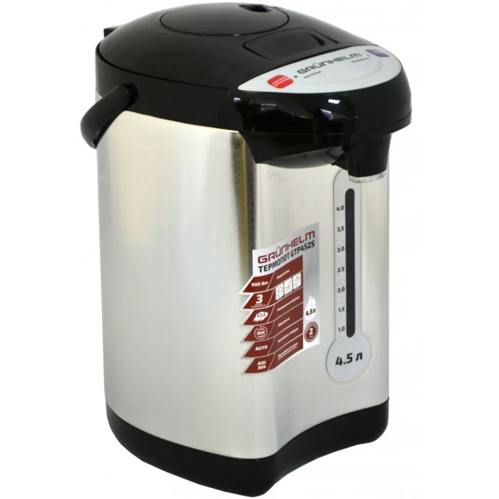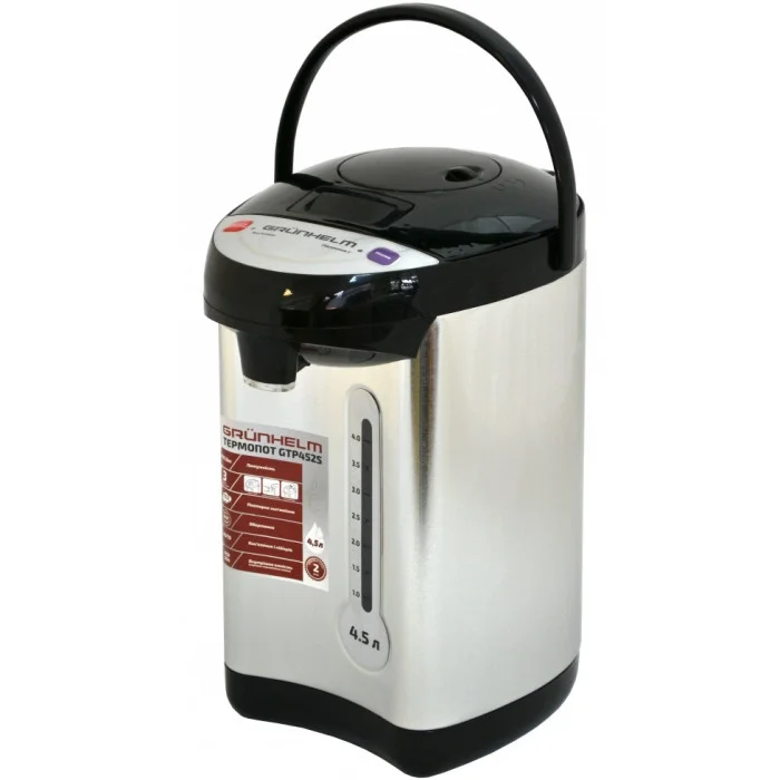 Термопот GTP425S Grunhelm обладает большой емкостью 4.5 л, что позволяет использовать его во время вечеринок, мероприятий или пикников. С помощью термопота можно подогреть остывшую воду с функцией "повторное кипячение". Горячая вода подается с помощью встроенного насоса, просто поставить чашку и нажать кнопку. Температуру нагрева воды можно регулировать, есть режим поддержания температуры.