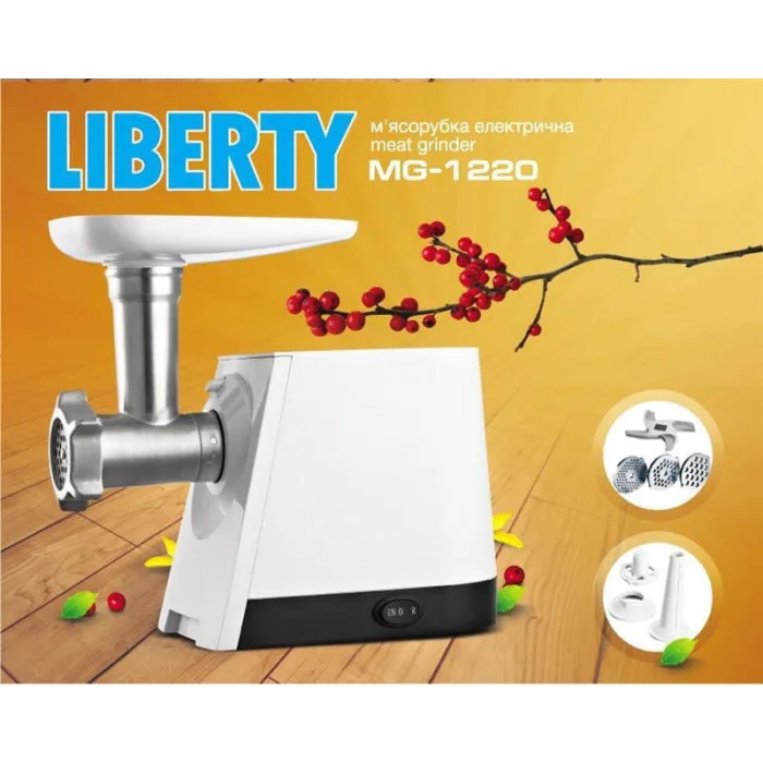 Мясорубка от LIBERTY отлично подойдет для приготовления домашних колбасок и измельчения мяса. Модель LIBERTY MG 1220 максимальной мощностью 1200 Вт за 1 минуту с легкостью превратит в фарш 1.4 кг мяса. Мясорубка имеет функцию обратной прокрутки, которая поможет перемолоть твердые части мяса и очистить забившуюся мясорубку. В комплекте с мясорубкой идет насадка для приготовления домашней колбасы и 3 решетки для фарша.