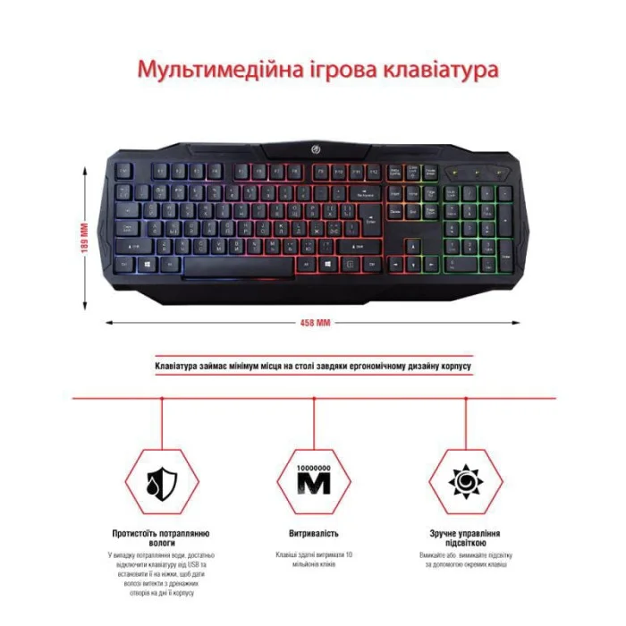 LED подсветка на выбор Эргономичный игровой дизайн Дренажные отверстия в клавиатуры Выносливость клавиш клавиатуры и кнопок мыши Износостойкая ткань коврика, которая предотвращает появление ворса