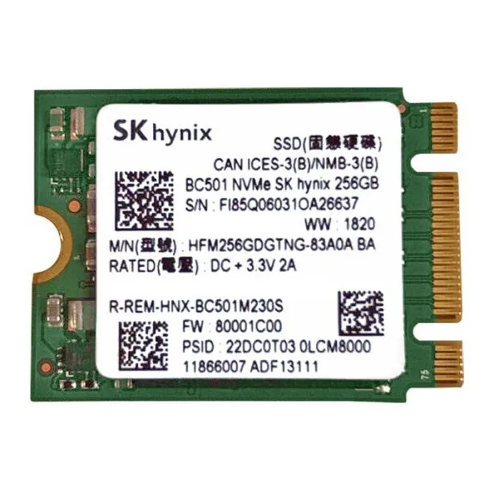 SK hynix BC501 256 ГБ NVMe PCIe M.2 2230 (HFM256GDGTNG-83A0A) – это твердотельный накопитель с емкостью 256 ГБ. Он имеет интерфейс NVMe PCIe 3.0 x2 и форм-фактор M.2 2230. Диск предназначен для использования как внутренний накопитель и совместим с разными ноутбуками и настольными ПК. Привод имеет скорость чтения 1600 МБ/с и скорость записи 860 МБ/с 12. Привод также энергоэффективным, потребляя только 3 Вт при чтении и 3,5 Вт при записи. В режиме ожидания он потребляет всего 40 мВт, а в режиме L1.2 – только 2,5 мВт.