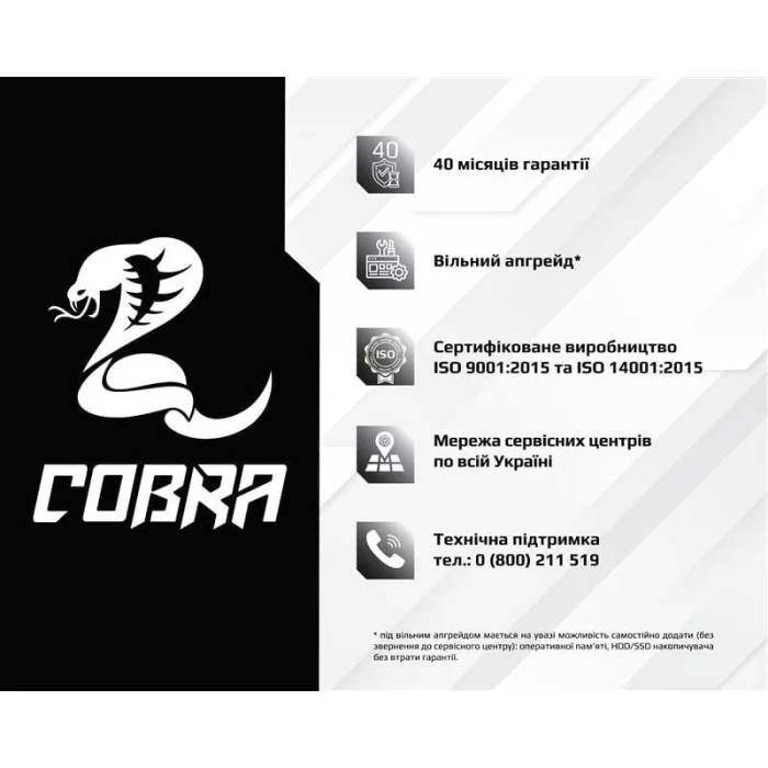 ПК COBRA собираются на базе комплектующих признанных мировых лидеров, таких как Intel, AMD, MSI, ASUS, Zalman, ProLogix, Seagate, Toshiba, Hitachi, Transcend, Kingston и др.